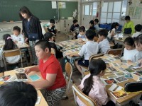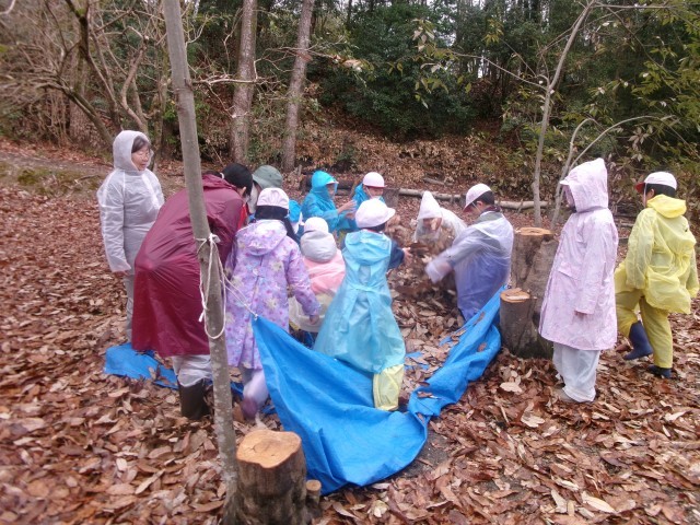 今日は、昨日とは違う学級がトヨタの森に出かけました。昨日とは違って雨のため、ちょっとドキドキ。合羽を着ての活動です。しかしながら、向こうでは雨もほとんど降らず、思いっきり葉っぱにもぐることもできました。木を揺らして、雨粒を落としたり、いいにおいのする木を教えてもらったり。昨日とはまた違った体験ができました。