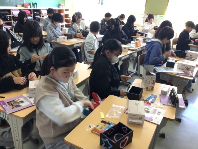 6年生の教室では、さまざまな物の最後の仕上げが進んでいました。作品袋に好きな絵を描いたり、卒業制作で、作った箱を組み立てたりしていました。友だちにサインや一言を書いてもらったり、小学校の絵を描いたり。それぞれの小学校生活最後の仕上げです。