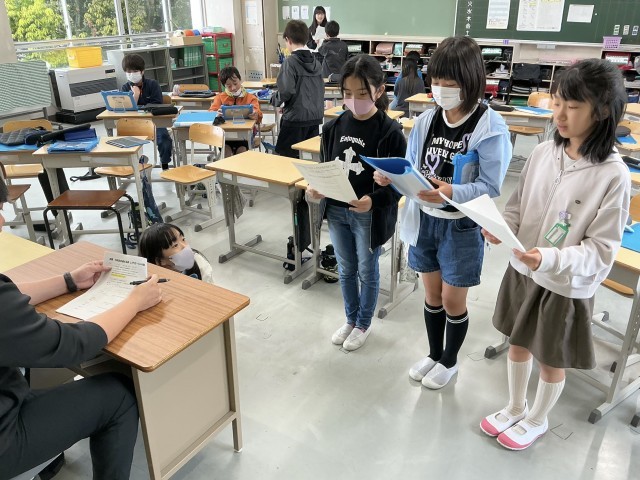 6年生が、1年生を迎える会の準備をしていました。司会の係の子は、練習をしたり、クイズを新しい学習用タブレットで作ったり、楽しそうにワイワイ集まって準備をしている子たちもあれば、1年生へのプレゼントの係の子は、真剣な顔で名簿と向き合い、1人も落ちがないようにとみんなでチェックをしていました。6年生のおかげで、すてきな会になりそうです。