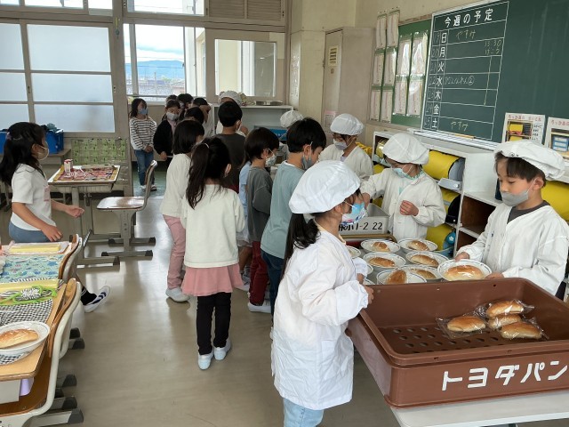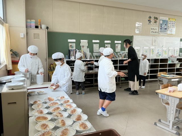 1年生の給食準備もすっかり慣れ、てきぱきと行えるようになってきました。給食当番の子たちも白衣をさっと身につけ、担当の係を行っています。並ぶ時にも、静かに並ぶことができるようになりました。1、2、3、4学級でも、高学年が中心となり、きちんと配っていきます。