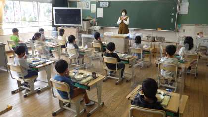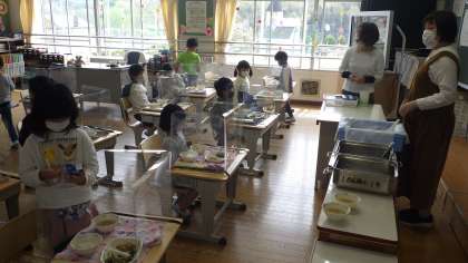 1年生は小学校で初めての給食です。担任の水町先生と養護教諭の近藤先生に手伝っていただきながら準備しました。静かに準備できる様子に感心しました。コロナ禍の為、楽しい会食の時間にはできませんが、制限された中でしっかり生活することができています。
