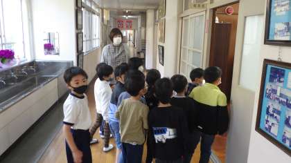 学校探検中の1年生に出会いました。