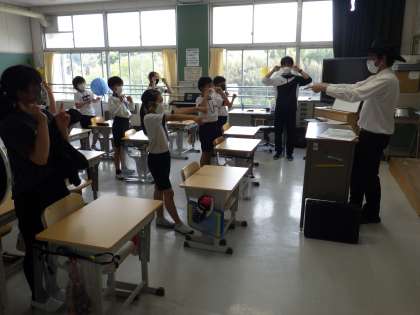 ジェイ先生の自己紹介はオールイングリッシュ(実は日本語上手)でしたが、アメリカテキサス州出身、ピザと担々麺が好きだと子どもたちはしっかり理解できていました。発音練習もゲーム形式で楽しく活動することができました。