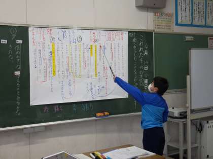 それぞれ想像したことを表現(音読)します。登場人物(月や楽器)のイメージや関係性を根拠に、声の工夫をしていました。それぞれの考えを伝え合う内に、友達の考えに影響を受け、意見に深まりが出た場面は感心しました。明日の授業参観での学び合いが楽しみです。