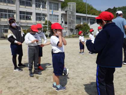 今日は縦割り班活動「わくわく班」の誕生会兼1年生歓迎会がありました。運動場に集まって班ごとに2種類のゲームをして遊びました。ゲームを説明する際、6年生は実際に前に立って見本として1ゲーム演じてくれました。とても分かりやすい説明に感心しました。説明のおかげで、ゲームの内容がわかり楽しい時間を過ごすことができました。