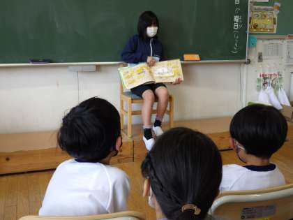 図書委員による絵本の読み聞かせがありました。一人ずつ担当の学年の教室を訪れ、前に座って絵本を読みました。それぞれの学年に合った絵本を準備して、時間いっぱいまで読んでくれました。全校で本に親しむ取組です。