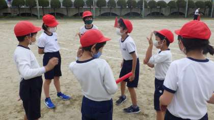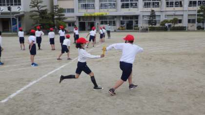 高学年はリレーの練習を始めました。チームごとに順番をどうするか、バトンゾーンのどこで渡すか等、考え始めました。作戦を立て競い合いながら今後様々な工夫を試していくことでしょう。工夫と練習の成果が運動会に発揮できるといいですね。