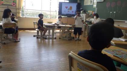 ICTデジタル教科書を使ってクイズ形式で全員順番に答えました。発表する人はみんなに向かって聞こえる声の大きさで発表する、聴く人は発表する人のほうを向く、授業をみんなで取り組むための約束を確認しながら進めています。