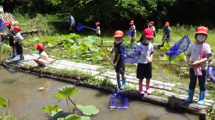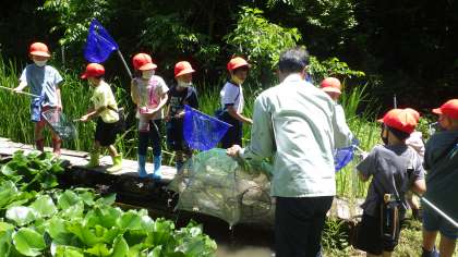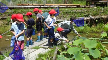 3年生の次に訪れた1年生は元気いっぱいにビオトープを散策しました。「生き物を見つけてごらん」と古田さんからテーマが出されると、オタマジャクシやカエル、メダカを網ですくい、古田さんに見てもらいました。1年生のお目当ての生物を最後に見せてもらうと、大満足の1年生でした。