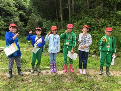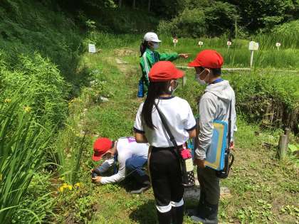 班のメンバーと協力してササユリの花やカエル、めだかを見つけて写真に撮りました。