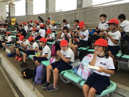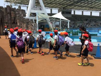 北館3階スタジアムでシャチのトレーニングを参観しながら全ての班がお弁当を食べています。