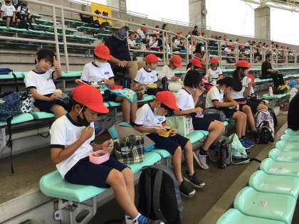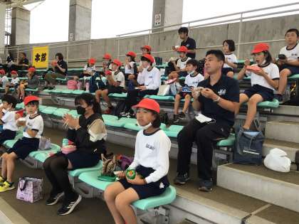 楽しくお弁当を食べています。お弁当の準備をありがとうございました。お弁当後も色々回る計画があるようですが、今はしっかり休憩をとっています。
