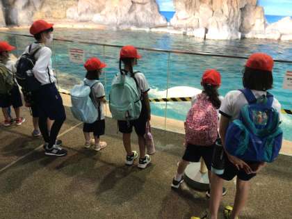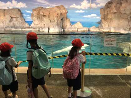 イルカショーが始まる前の数十分を積極的に見学する班がありました。シロイルカのベルーガを見に行った班についていきました。息継ぎに顔を出すベルーガの可愛い顔に癒されました。