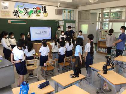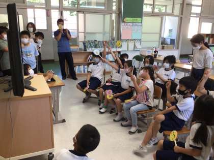 5年生は2年生に、丸根山ビオトープの生物に関してクイズの出題を準備してくれました。7種類の生物の写真を投影して、名前を当てるクイズでした。アゲハチョウはともかく、マダラバッタやセスジスズメの幼虫を当てる2年生がいて、その知識に驚きました。