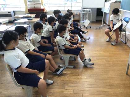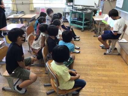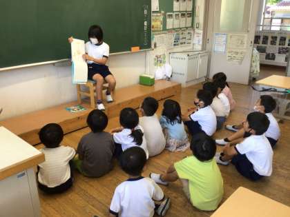 1年生の教室では「100階建ての家」2年生の教室ではオニの登場するお話が3年生の教室では子どもたちに人気の「おしり探偵」の読み聞かせでした。