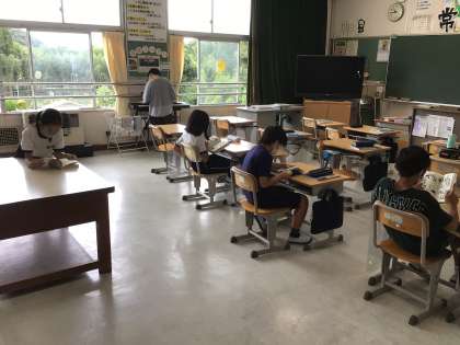 登校している子どもたちは元気に過ごしています。雨がやみましたので、運動場に出て学年混合でドッジボールをしたり、教室で静かに過ごしたりしています。