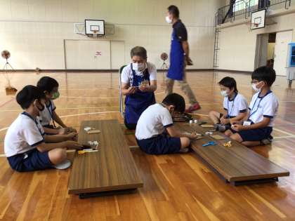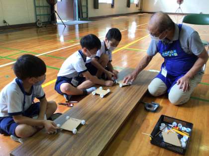ものづくりサポーターを講師にお招きして3年生がものづくり教室を行っています。段ボールや竹ひご、ペットボトルキャップを組み合わせて車を作ります。講師の方の説明を聞き、友だちと協力してニッパーを使い、自分の車(レーサー)を作りました。180センチ転がれば合格です。品質の良い車が作られたでしょうか。