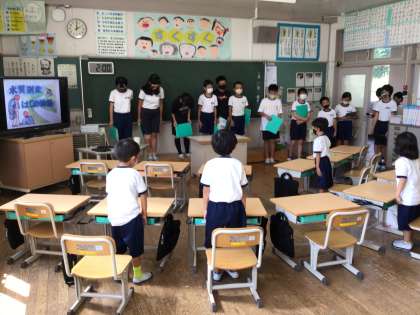 6年生は1年生に「水質測定はじめ物語」の紙芝居を読み聞かせました。今から46年前の水質測定を始めた頃の透視度が1センチぐらいだったこと、清流の塔の名前をつけた人は当時の6年生だったことなどをクイズを通して1年生に伝えました。最後に楽しい時間だったと1年生は答えていました。
