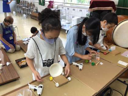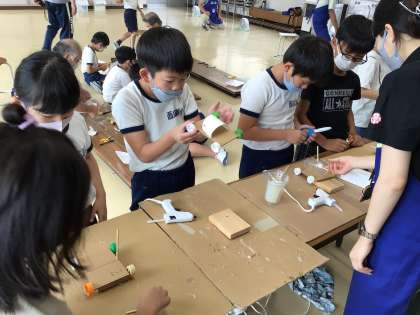 ホットボンドを使って自分で車体と帆をつなげていました。早く遠くまで走るレーサーを作るために、走らせては改良、また走らせてと工夫を重ねていました。考えた工夫をすぐに製作できるよさが、このプログラムの魅力だと感じました。
