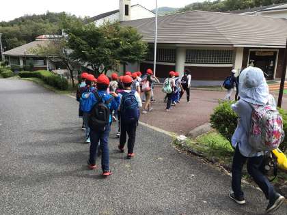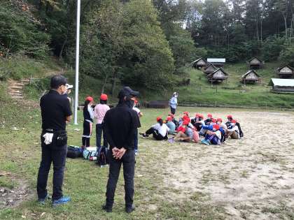 六所山自然の家に着き、入所式を行いました。所長さんより、六所で様々な事を見つけて頑張れるように、所員さんからは、キャンプサイト周辺の秋の気配を教えていただきました。今から荷物をテントに運び込みます。