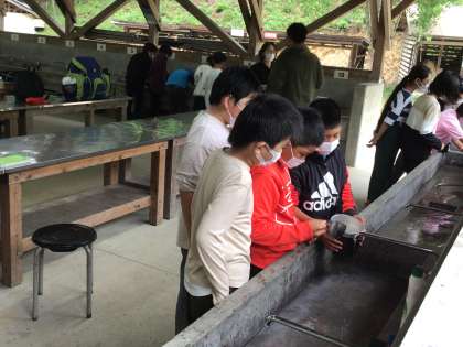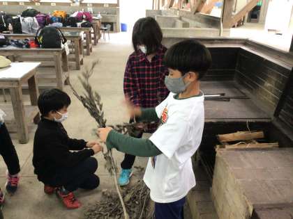 釜飯作りに向けて、飯盒に米を入れて計量カップで慎重に水を入れました。次にかまどに薪を組みました。火がつきやすいように枝と新聞を差し込みました。キャンプファイヤーで火の神が話したように、苦労しながらも工夫をして、火を使って調理をします。