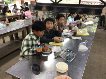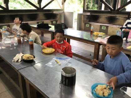 食事が完成するまで、大変な作業が続きましたが、これもキャンプの経験としてどの子も前向きに取り組みました。苦労して作ったご飯はおいしいと、子どもたちは喜んで食べています。