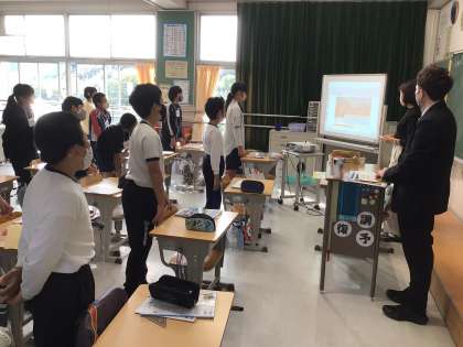 今日はALTイアン・ルドルフ先生の外国語の授業がありました。6年生の授業は今日の月日や天気を英語で確認して始まり、「どこに住んでいるか尋ね合う」内容でした。