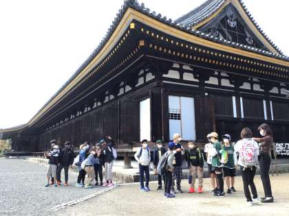 三十三間堂を見学しています。担当の児童が施設の紹介をしてから見学を始めました。後白河上皇や平清盛など歴史上の人物が関わった施設の重厚感に子どもたちは圧倒されているようです。お香の香りに「おばあちゃんの家みたい」と喜ぶ子もいます。本堂見学後は、班ごとに庭を散策しています。
