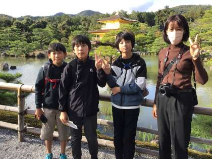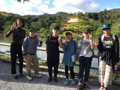金閣を間近にみられて子どもたちは喜んでいます。きれいなのは金箔だけでなく整備された庭園にも美しさが感じられました。気に入った風景を班のカメラで撮影しています。