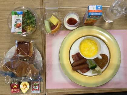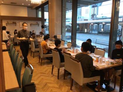 朝の京都駅を眺めながら朝食をとっています。健康観察では、全員平熱でした。