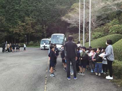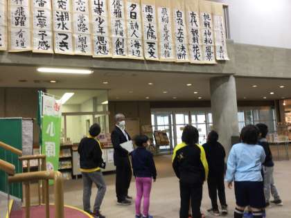会場の小原交流館に着くと、待機場所のホールに移動しました。館内には提示されている小中学生の上手な習字作品がありました。「1年生って、中学1年だよね」子どもたちは感心して見上げていました。