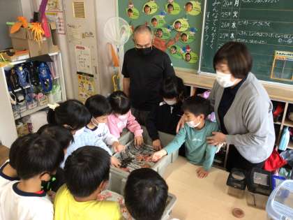 9月26日に1年生が制作した作品が完成しました。陶芸家の石黒さんが自宅の窯で焼き上げ届けてくださいました。鮮やかな色に光り輝く陶器の作品を見て、子どもたちは興奮気味でした。