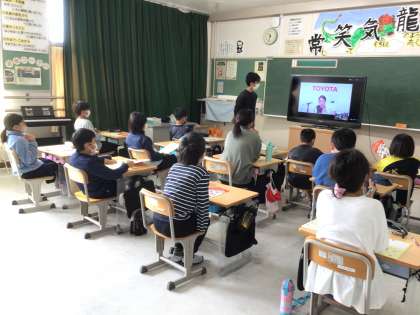 5年生教室とトヨタ会館をネットで結びオンライン授業を行いました。自動車生産の説明や工場の工夫を解説してくださいました。実際に工場に出掛ける社会見学が出来ない現状で、小学生のために対応してくださるトヨタ自動車の活動をありがたく感じました。また、生産者の動画からは、車づくりのやりがいが伝わり、働くことに関して、子どもたちが考える機会になりました。最後の質問時間ではハイブリットシステムや品質検査を質問し、生産台数の多さに驚いた感想を5年生は述べていました。