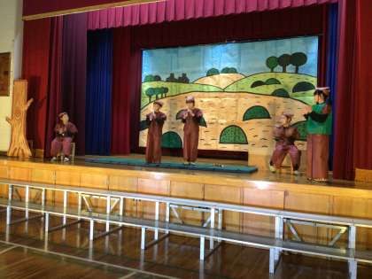聞き取りやすい声、大きな声量でのびのびと演技していました。リコーダーを使ったBGMが素敵です。主人公のグーに向けるお母さんの愛情に感動し、さらにクライマックスでそれに気づくグーの台詞が感動的でした。その雰囲気をさらに盛り上げられるように、最後の歌の特訓をアドバイスしました。