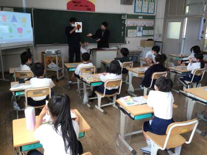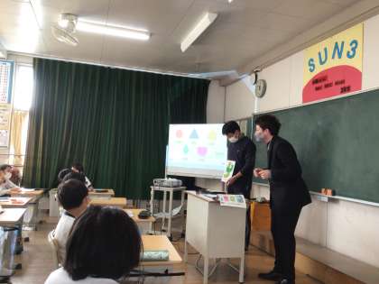 ALTイアン先生の授業の日です。3年生の教室に行くと、村松先生とイアン先生が昆虫のイラストを持っていました。Flyはハエ、Dragonflyはトンボ、Bugは昆虫、Ladybugはてんとう虫というように、関連づけて覚えられるように説明してから声に出して読んでいました。バッタのGrasshopperでは、草にいて跳ぶ!と子どもたちから声が上がっていました。