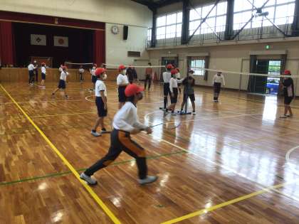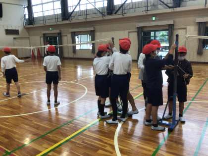 体育館で高学年が体育の授業を行なっています。体育館にやってきたら各自でコートを設置していました。バドミントンの桃田選手の試合映像から、プレーのコツを学んでいるので、身に付けられるような練習も考えられています。とても楽しそうでした。