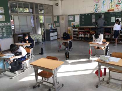 4年生は学習タイム中でした。各自ドリルなどに集中して取り組む中、係の児童が担当する役割を進めてくれていました。