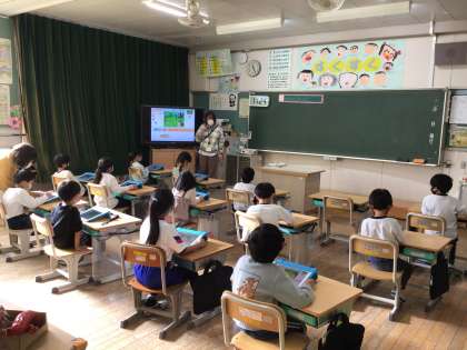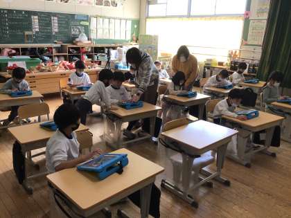 1年生はアプリ、スクラッチjrを使いました。キャラクターを指定したり、リンゴを下向きに動かす命令をしたりして、プログラミングを学びました。自分が命令した通りにキャラクターやリンゴが動く様子を見て、子どもたちも、驚いたり喜んだり、様々な反応を見せていました。