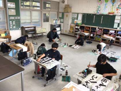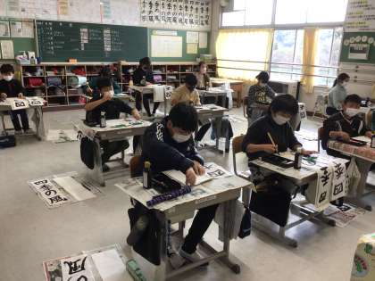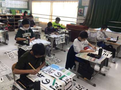 5年生の課題は「四季の風」です。朝の体育館の室温は3度、今日も冷たい風が吹いていますが、多くの児童は運動場に出て遊びます。今年も自然の中で元気に生活しようとする気持ちを字にこめてほしいです。