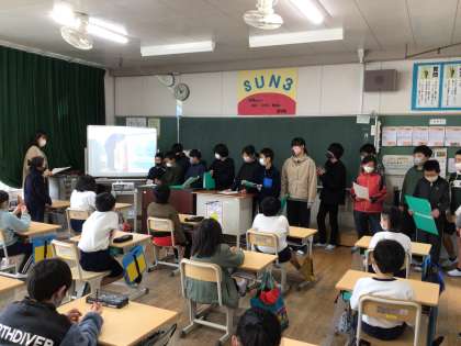 6年生が3年生に、水質検査の意義をクイズにして伝えました。先日のくすのき学習発表会で披露した「水のハーモニー」を歌い、歌詞に込められたメッセージを伝えました。