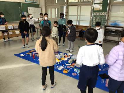 4年生は1年生にゴミの分別を教えました。ゲームで釣ったゴミの種類ごとに分別の仕方を優しく教えてくれました。