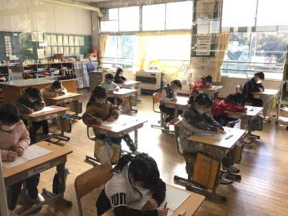 今日から2日間、全学年で学力テストを実施しています。1年間の学習が定着しているか確認のためのテストです。不十分な点に気づき、4月の進級前に補充ができる事をねらっています。はじめは国語の聞き取り問題からです。音声による説明を、緊張した表情で聴いています。