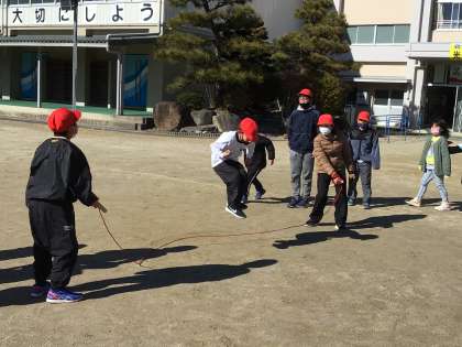学力テスト本日分も終わり、給食後の休憩時間に縦割り班に分かれて長縄跳び練習を行っています。天気は快晴、暖かい中で楽しく活動しています。