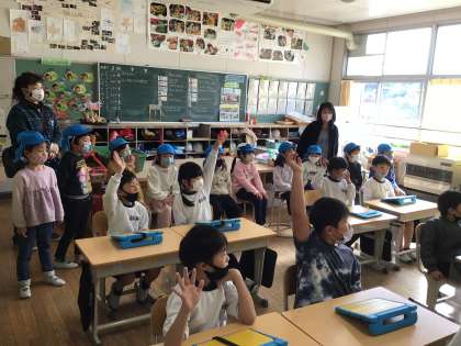 透成こども園の年長児が見学に来てくれました。最初に1年生の算数の授業を参観しました。時計の見方をタブレットPCを使って学んでいます。