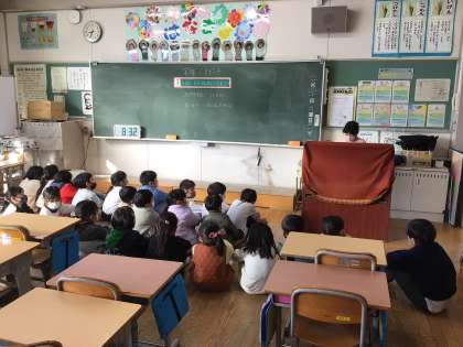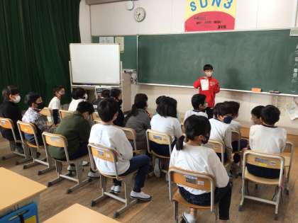 朝の学習タイムに低学年と中学年が学年部スピーチを行いました。
