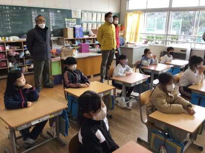 近藤区長さん堀区長さん、共働本部コーディネーターの清水さんに3施設ペア学習を参観していただきました。学校の教育目標に沿った活動がなされているか、6月に引き続き見ていただきました。6年生は2年生に水質調査活動の意義をクイズで伝え、「水のハーモニー」「ムササビムー君」の歌を教え、一緒に歌いました。