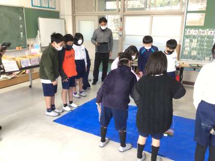 4年生は3年生にゴミの分別を、釣りゲームを通して楽しみながら伝えていました。資源として再利用できるゴミを皆で分別しました。ペットボトルは2つに割れていると燃やすゴミになる、プラスティック製容器包装は回収して資源になるので燃やさないなど、4年生が学習した事を3年生に分かりやすく教えました。