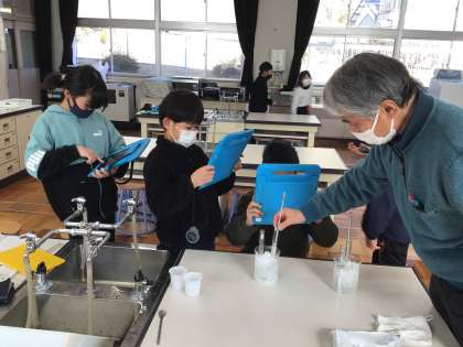 水を冷やし続けた時の様子を実験していました。0度で凍る事は皆予想が一致しましたが、体積が増える、減ると予想が分かれたので実験結果が楽しみです。写真を撮った際はマイナス10度でした。