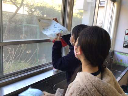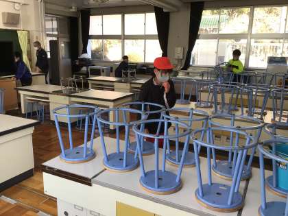 6年生は金曜日にワックス掛けをした理科室に荷物を搬入していました。