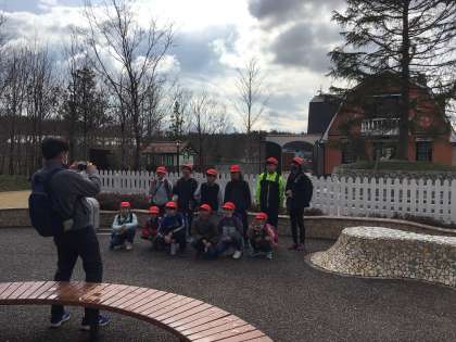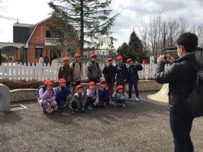 地球屋の建物前で写真を撮っています。ここは今回、予約していない施設なので、外から眺めて満足してもらいました。